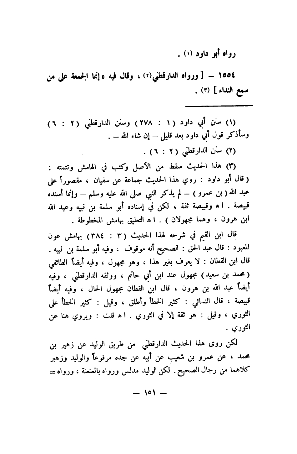 1554-[ورواه الدارقطني 1 وقال فيه: "إنما الجمعة على من سمع النداء" 2] .