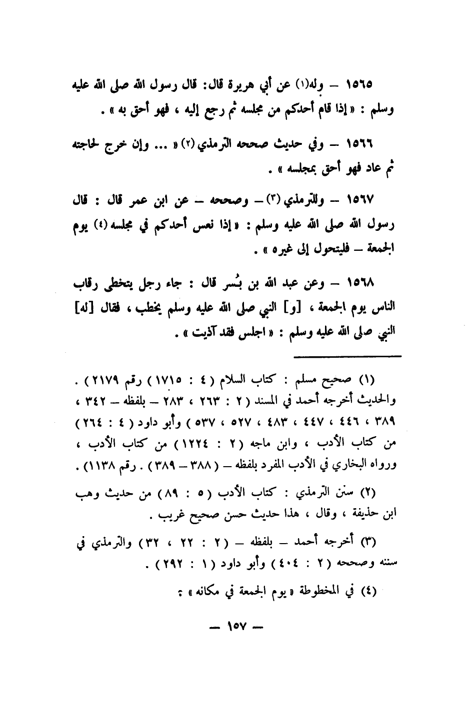 1566- وفي حديث صححه الترمذي: 2 " ... وإن خرج لحاجته ثم عاد فهو أحق بمجلسه".