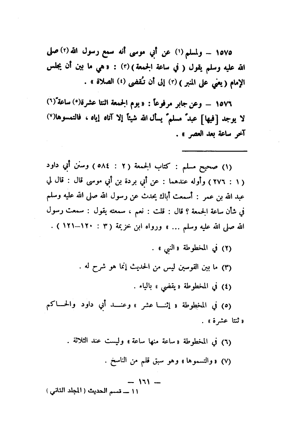 1575- ولمسلم 1 عن أبي موسى: "أنه سمع رسول الله 2 صلى الله عليه وسلم يقول (في ساعة الجمعة) : 3 هي ما بين أن يجلس الإمام (يعني على المنبر) 4 إلى أن تُقضى الصلاة" 5.