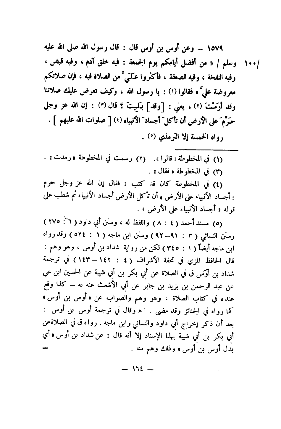 1579- وعن أوس بن أوس قال: قال رسول الله صلى الله عليه وسلم: "من أفضل أيامكم يوم الجمعة: فيه خلق آدم، وفيه قبض، وفيه النفخة، وفيه الصعقة؛ فأكثروا عَلَيَّ من الصلاة فيه؛ فإن صلاتكم معروضة عليَّ. فقالوا: 1 يا رسول الله، وكيف تعرض عليك صلاتنا وقد أرمتَ 2 يعني: [وقد] بَلِيتَ؟ قال: 3 إن الله عز وجل حَرَّمَ على الأرض أن تأكلَ أجسادَ الأنبياءِ 4 [صلوات الله عليهم] ". رواه الخمسة إلا الترمذي 5.