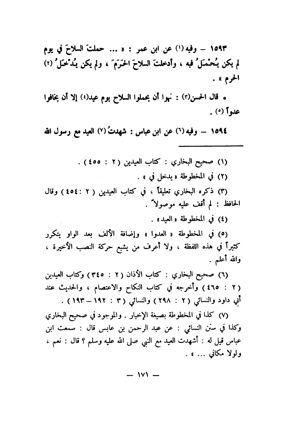 1593- وفيه 1 عن ابن عمر: " ... حملتَ السلاحَ في يوم لم يكن يُحْمَلُ فيه، وأدخلتَ السلاحَ الحَرَمَ، ولم يكن يُدْخَلُ 2 الحرم".