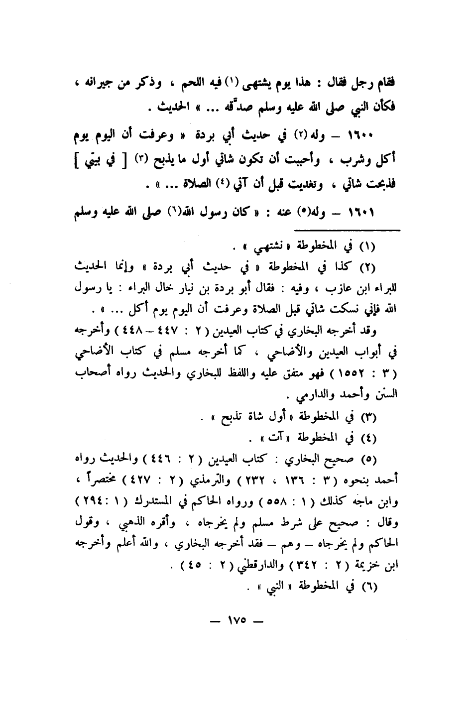 1600- وله 2 في حديث أبي بردة: "وعرفت أن اليوم يوم أكل وشرب، وأحببت أن تكون شاتي أول ما يذبح 3 [في بيتي] ، فذبحت شاتي، وتغديت قبل أن آتي 4 الصلاة".