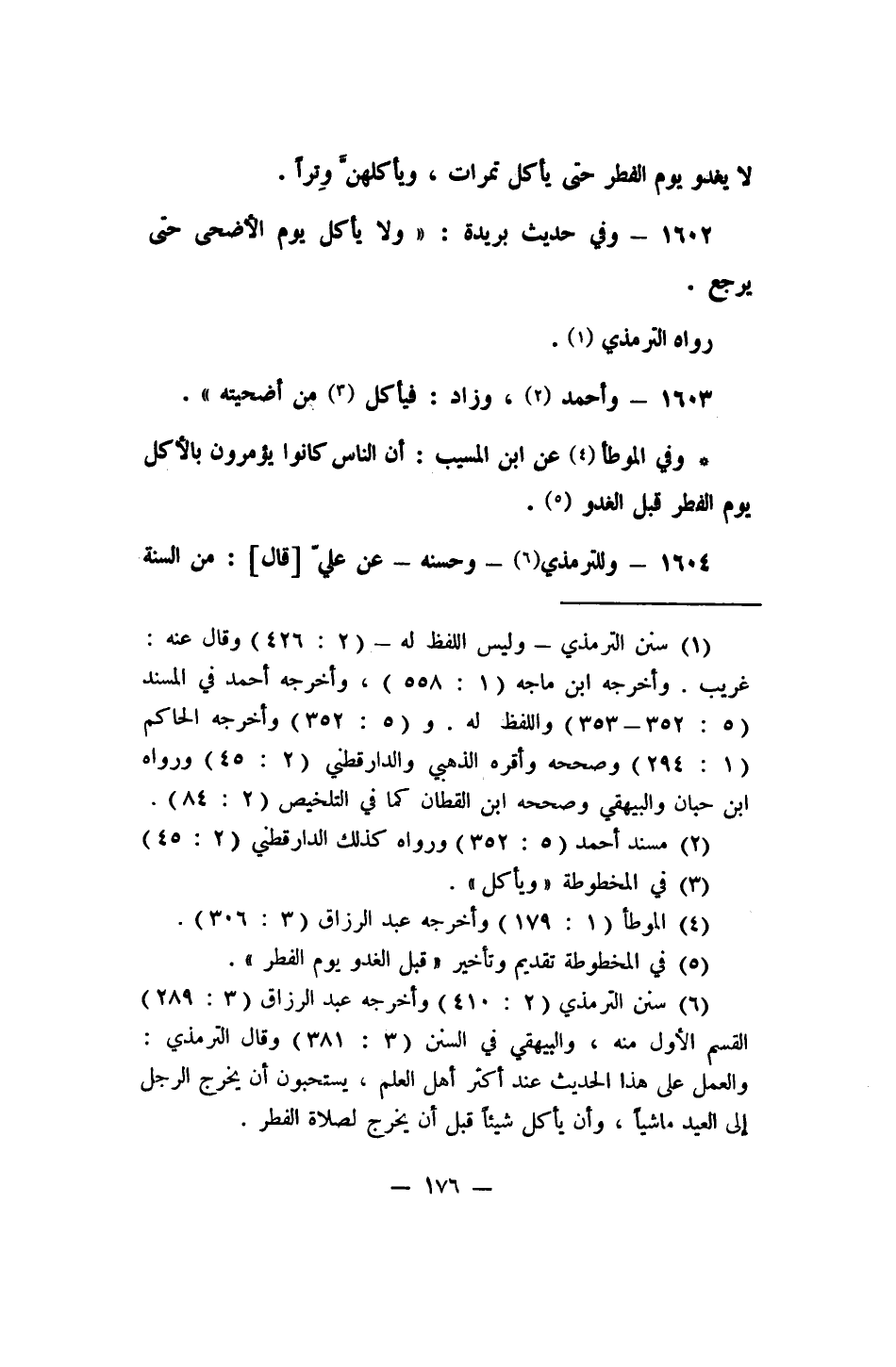 1602- وفي حديث بريدة: "ولا يأكل يوم الأضحى حتى يرجع". رواه الترمذي 1.