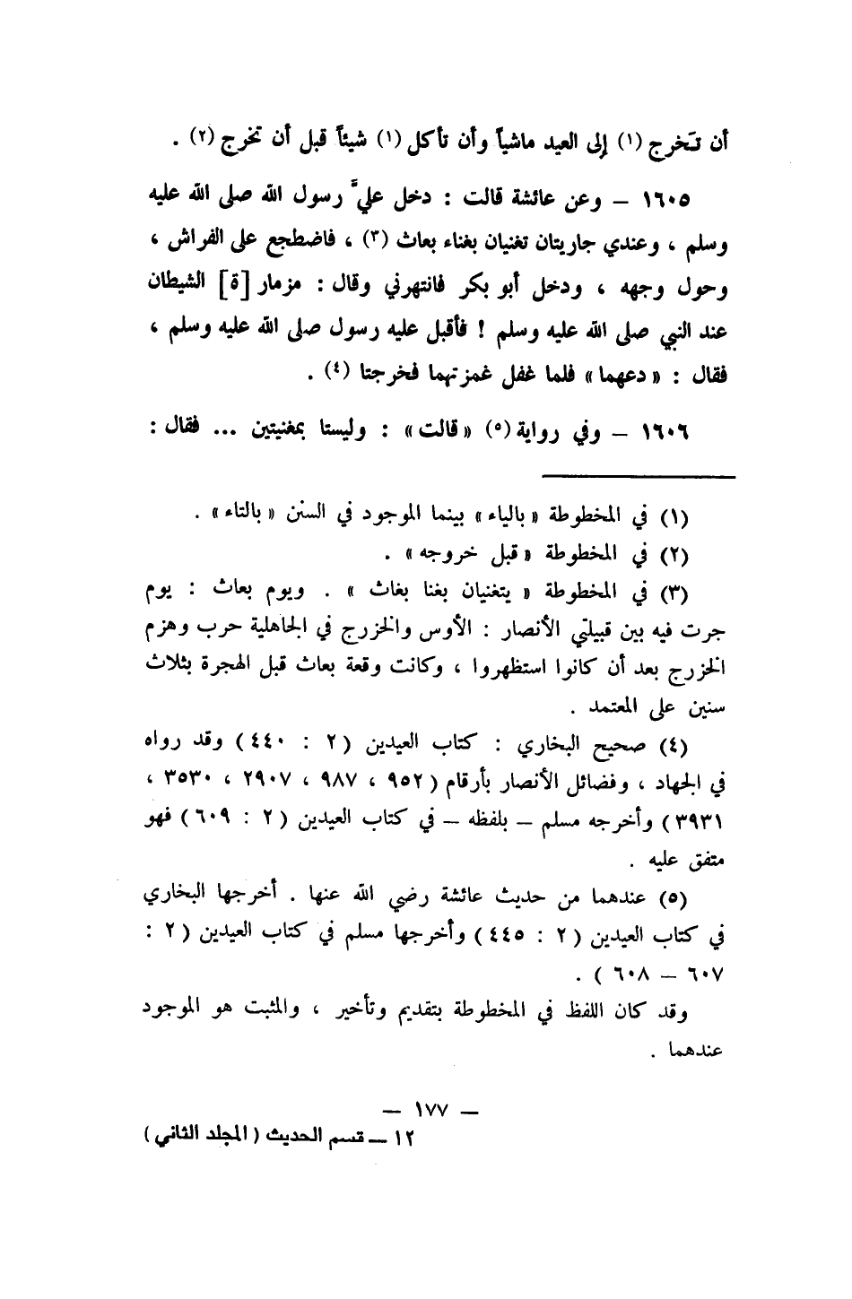 1605- وعن عائشة قالت: "دخل عليَّ رسول الله صلى الله عليه وسلم، وعندي جاريتان تغنيان بغناء بعاث، 4 فاضطجع على الفراش، وحول وجهه. ودخل أبو بكر فانتهرني، وقال: مزمار [ة] الشيطان عند النبي صلى الله عليه وسلم! فأقبل عليه رسول صلى الله عليه وسلم فقال: دعهما. فلما غفل غمزتهما فخرجتا" 5.