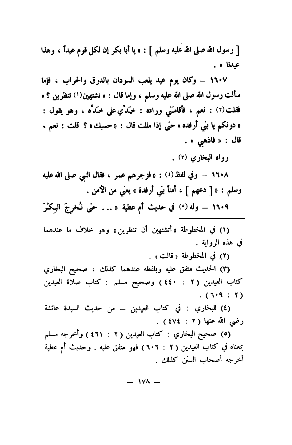 1607- "وكان يوم عيد يلعب السودان بالدرق والحراب، فإما سألت رسول الله صلى الله عليه وسلم، وإما قال: تشتهين 1 تنظرين؟ فقلت: 2 نعم، فأقامني وراءه: خدي على خده، وهو يقول: دونكم يا بني أرفده! حتى إذا مَلِلْتُ، قال: حَسْبُكِ؟ قلتُ: نعم، قال: فاذهبي". رواه البخاري 3.