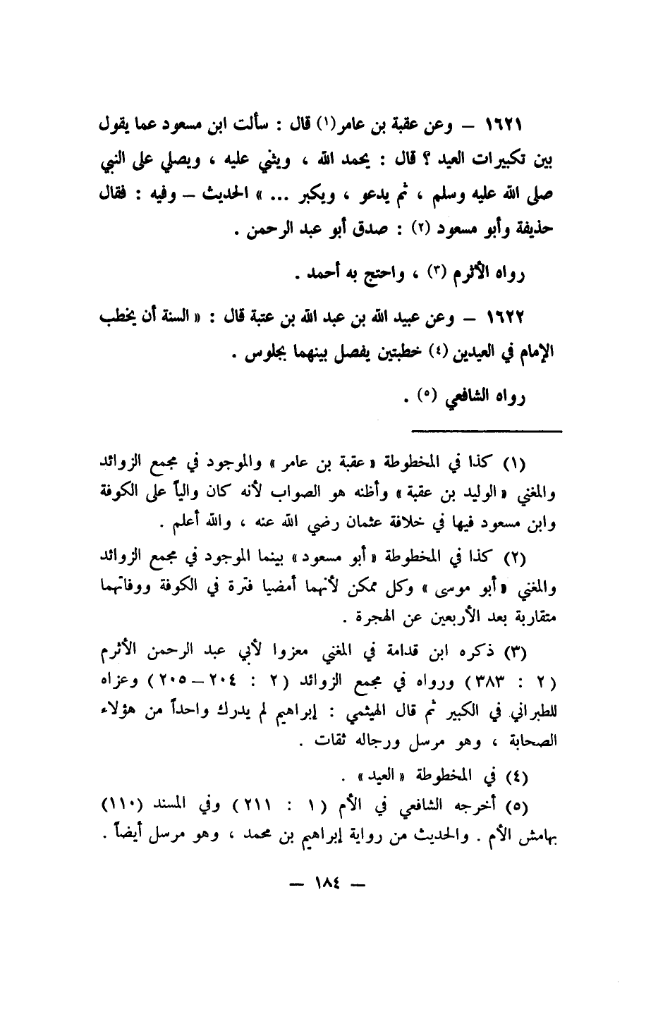 1621- وعن عقبة بن عامر 1 قال: "سألت ابن مسعود عما يقول بين تكبيرات العيد؟ قال: يحمد الله، ويثني عليه، ويصلي على النبي صلى الله عليه وسلم، ثم يدعو، ويكبر" الحديث، وفيه: فقال حذيفة وأبو مسعود: 2 صدق أبو عبد الرحمن. رواه الأثرم، 3 واحتج به أحمد.
