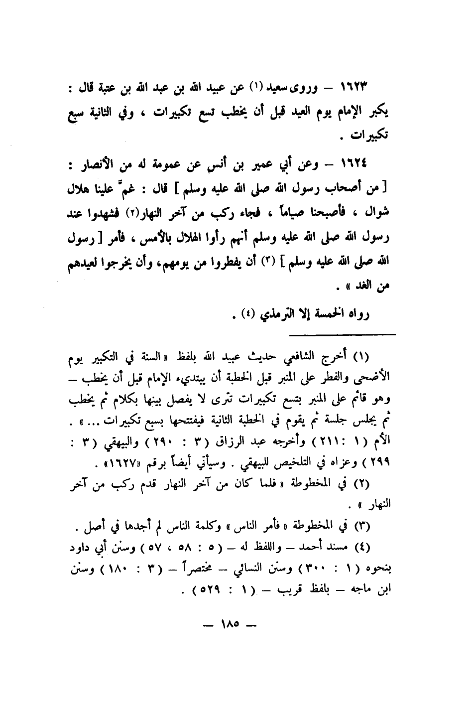1624- وعن أبي عمير بن أنس عن عمومة له من الأنصار: [من أصحاب رسول الله صلى الله عليه وسلم] قال: "غمَّ علينا هلال شوال، فأصبحنا صياماً، فجاء ركب من آخر النهار، 2 فشهدوا عند رسول الله صلى الله عليه وسلم أنهم رأوا الهلال بالأمس، فأمر [رسول الله صلى الله عليه وسلم] 3 أن يفطروا من يومهم، وأن يخرجوا لعيدهم من الغد". رواه الخمسة إلا الترمذي 4.