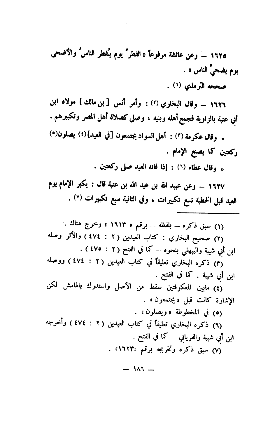 1625- وعن عائشة، مرفوعا: "الفطر يوم يفطر الناس، والأضحى يوم يضحِّي الناس". صححه الترمذي 1.