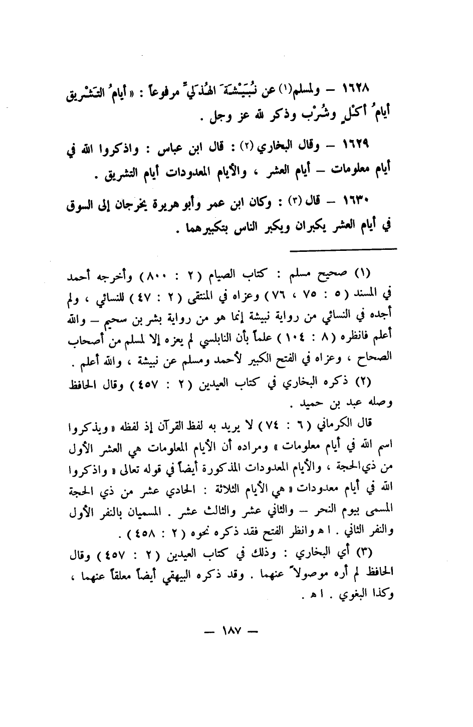 1628- ولمسلم 1 عن نبيشة الهذلي، مرفوعا: "أيام التشريق أيامُ أكْلٍ وشُرْب وذكر لله عز وجل".