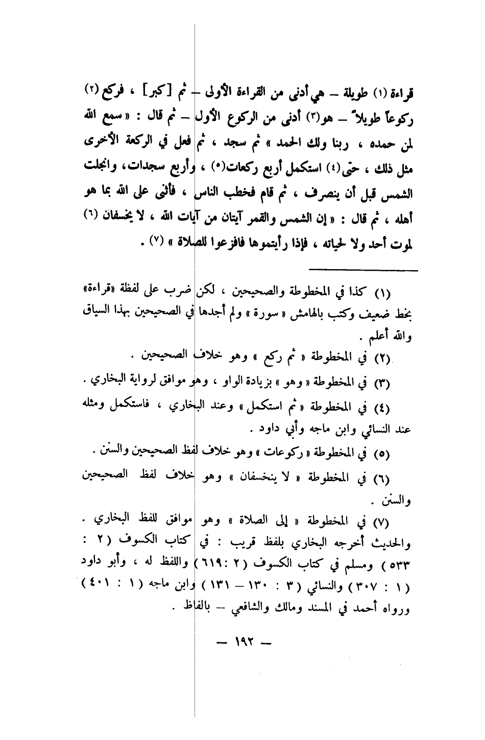 7 في المخطوطة: (إلى الصلاة) ، وهو موافق للفظ البخاري. والحديث أخرجه البخاري بلفظ قريب في كتاب الكسوف (2/533) ، ومسلم في كتاب الكسوف (2/619) واللفظ له، وأبوداود (1/307) ، والنسائي (3/130، 131) ، وابن ماجة (1/401) ، ورواه أحمد في المسند ومالك والشافعي، بألفاظ.