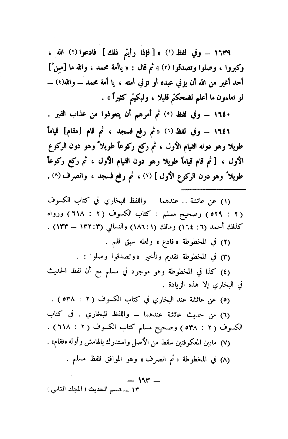 1641- وفي لفظ: 6 "ثم رفع فسجد، ثم قام [فقام] قياماً طويلا وهو دون القيام الأول، ثم ركع ركوعاً طويلاً وهو دون الركوع الأول، [ثم قام قياماً طويلا وهو دون القيام الأول، ثم ركع ركوعاً طويلاً وهو دون الركوع الأول] 7، ثم رفع فسجد، وانصرف" 8.