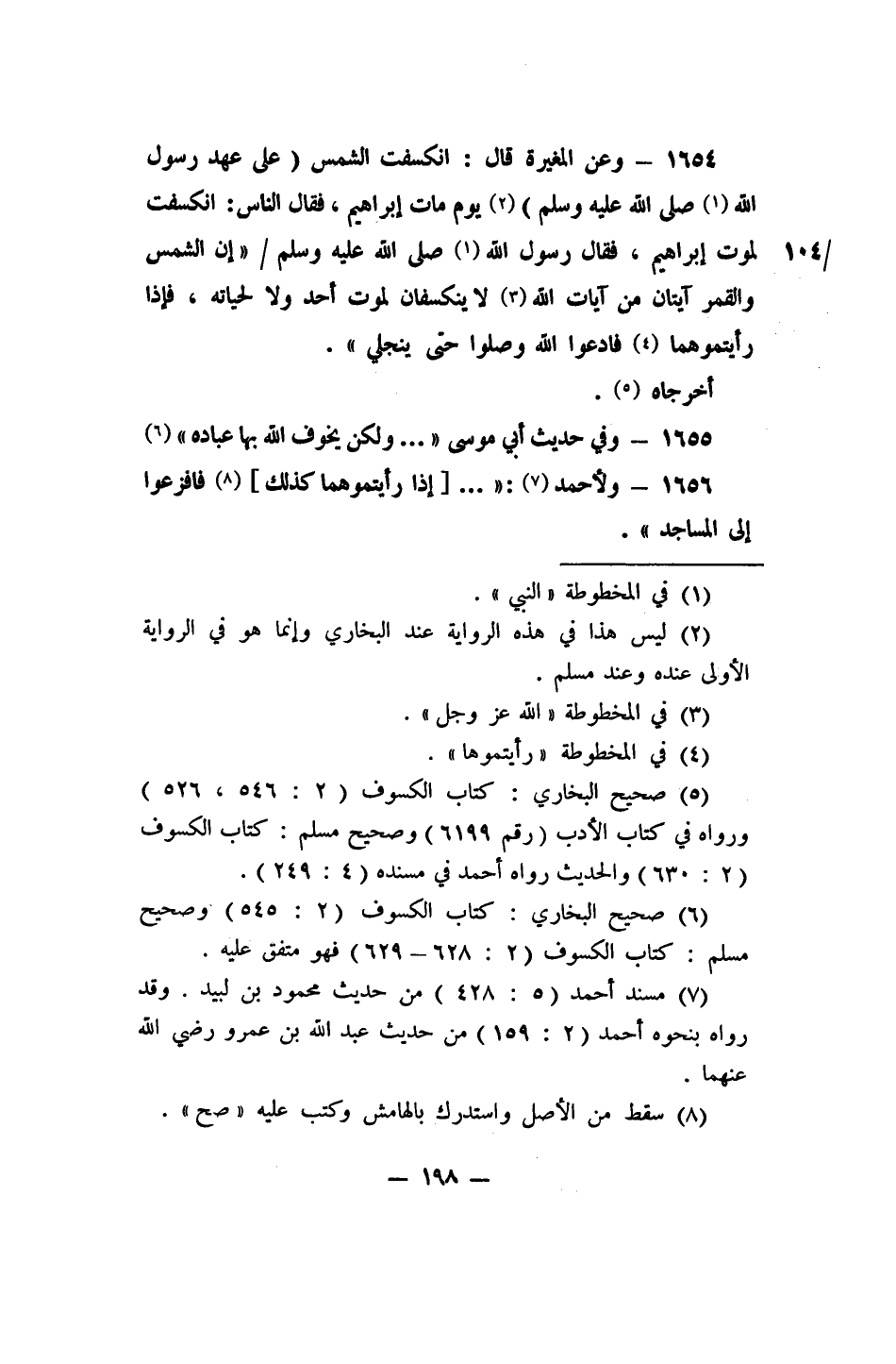 1654- وعن المغيرة قال: "انكسفت الشمس (على عهد رسول الله 1 صلى الله عليه وسلم) 2 يوم مات إبراهيم، فقال الناس: انكسفت لموت إبراهيم، فقال رسول الله 3 صلى الله عليه وسلم: "إن الشمس والقمر آيتان من آيات الله، 4 لا ينكسفان لموت أحد ولا لحياته؛ فإذا رأيتموهما 5 فادعوا الله، وصلوا حتى ينجلي". أخرجاه 6.