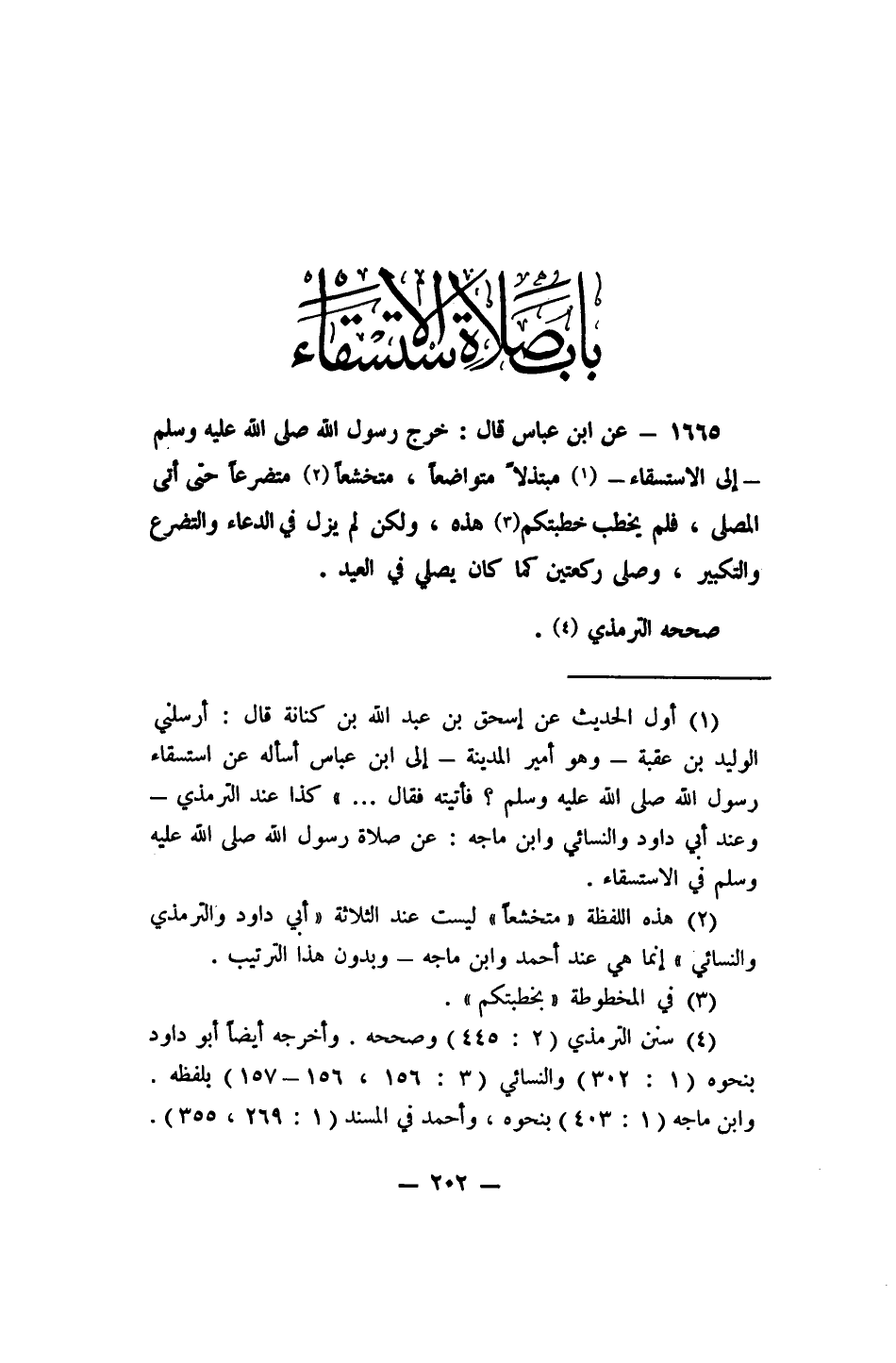 1665- عن ابن عباس قال: "خرج رسول الله صلى الله عليه وسلم إلى الاستسقاء 1 مبتذلاً متواضعاً، متخشعاً 2 متواضعاً، حتى أتى المصلى. فلم يخطب خطبتكم 3 هذه، ولكن لم يزل في الدعاء والتضرع والتكبير. وصلى ركعتين كما كان يصلي في العيد". صححه الترمذي 4.