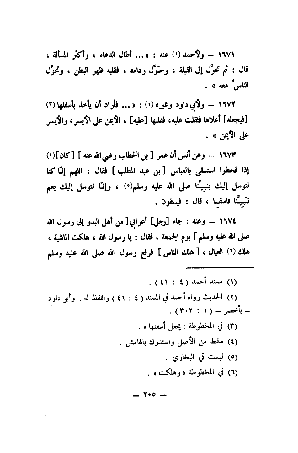 1673- وعن أنس: "أن عمر [بن الخطاب، رضي الله عنه] [كان] 5 إذا قحطوا استسقى بالعباس [بن عبد المطلب] ، فقال: اللهم إنّا كنا نتوسل إليك بنبِيِّنا صلى الله عليه وسلم، 6 وإنّا نتوسل إليك بعم نَبِيِّنا، فاسقِنا. قال: فيُسقوْن".