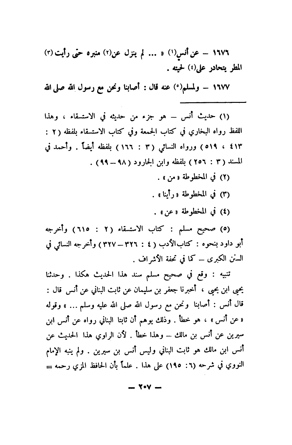 1676- عن أنس: 1 " ... لم ينْزل عن 2 منبره حتى رأيت 3 المطر يتحادر على 4 لحيته".