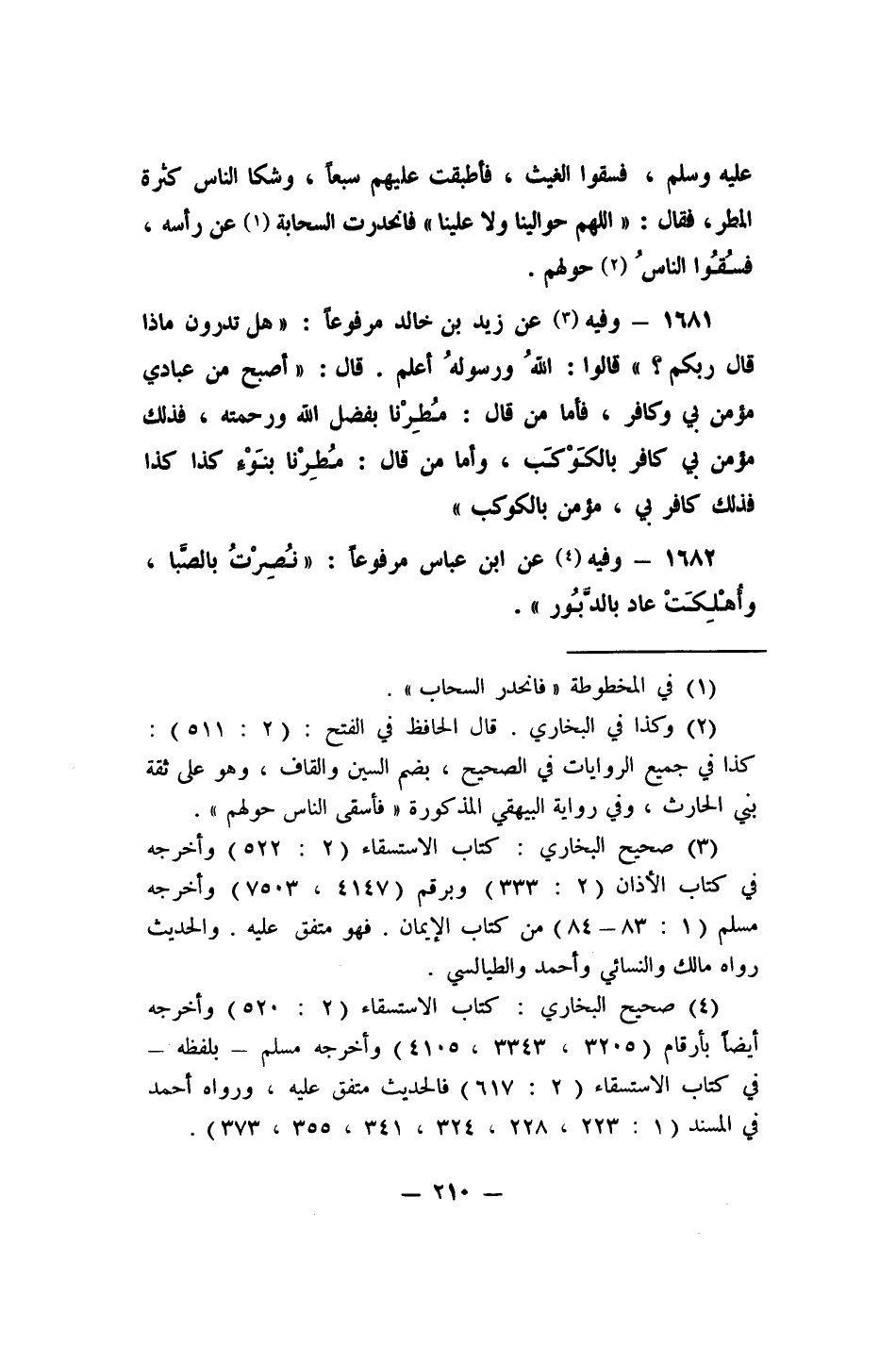 1681- وفيه 3 عن زيد بن خالد، مرفوعاً: "هل تدرون ماذا قال ربكم؟ قالوا: اللهُ ورسولهُ أعلم. قال: أصبح من عبادي مؤمن بي وكافر: فأما من قال: مُطرنا بفضل الله ورحمته، فذلك مؤمن بي كافر بالكَوْكَب، وأما من قال: مُطرنا بنوْء كذا كذا، فذلك كافر بي مؤمن بالكوكب".