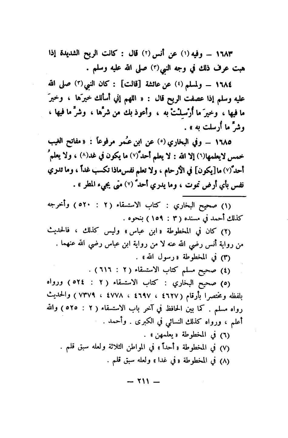 1685- وفي البخاري 5 عن ابن عُمر، مرفوعاً: "مفاتح الغيب خمس، لا يعلمها إلا الله: لا يعلم أحدٌ 6 ما يكون في غد، 7 ولا يعلمُ أحدٌ 8 ما [يكون] في الأرحام، ولا تعلم نفس ماذا تكسب غداً، وما تدري نفس بأي أرض تموت، وما يدري أحدٌ 9 متى يجيء المطر".