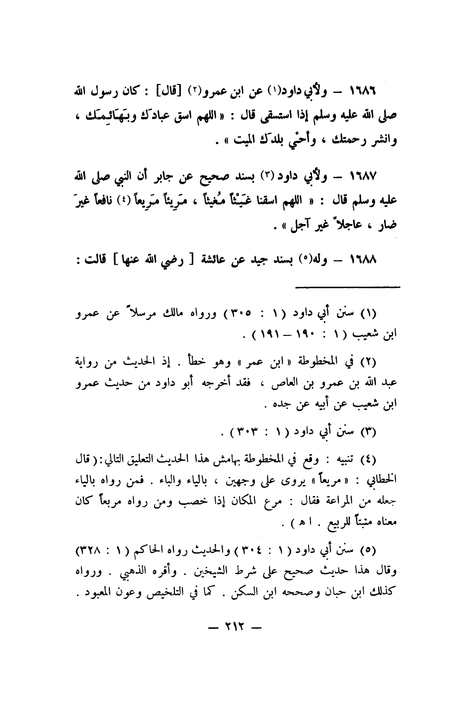 1687- ولأبي داود 4 بسند صحيح عن جابر أن النبي صلى الله عليه وسلم قال: "اللهم اسقنا غَيْثاً مُغيثاً، مَرِيئاً مَرِيعاً نافعاً غيرَ ضار، عاجلاً غير آجل" 5.