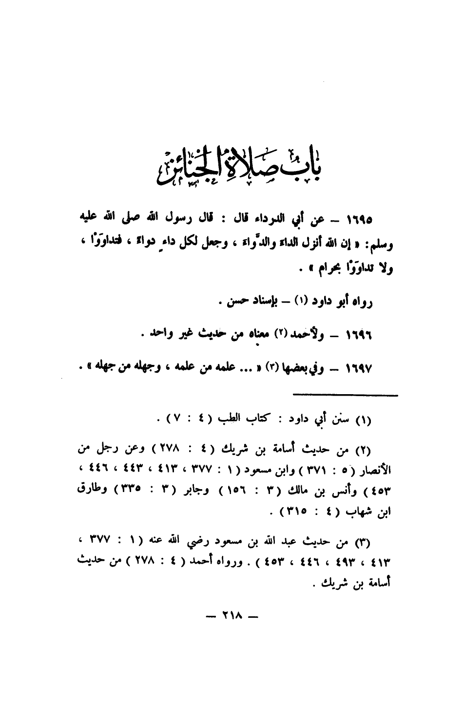 1695- عن أبي الدرداء قال: قال رسول الله صلى الله عليه وسلم: "إن الله أنزل الداء والدواء، وجعل لكل داء دواء، فتداووا، ولا تداووا بحرام". رواه أبو داود، 1 بإسناد حسن.