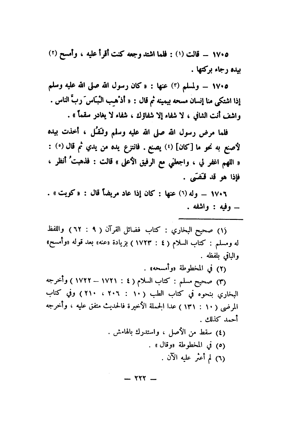 1705- ولمسلم 3 عنها: "كان رسول الله صلى الله عليه وسلم إذا اشتكى منا إنسان مسحه بيمينه، ثم قال: أذْهِب الْبَاسَ ربَّ الناس. واشف أنت الشافي، لا شفاء إلا شفاؤك، شفاء لا يغادر سقماً. فلما مرض رسول الله صلى الله عليه وسلم وثَقُل، أخذت بيده لأصنع به نحو ما [كان] 4 يصنع، فانتزع يده من يدي ثم قال: 5 اللهم اغفر لي، واجعلني مع الرفيق الأعلى. قالت: فذهبتُ أنظر، فإذا هو قد قَضَى".