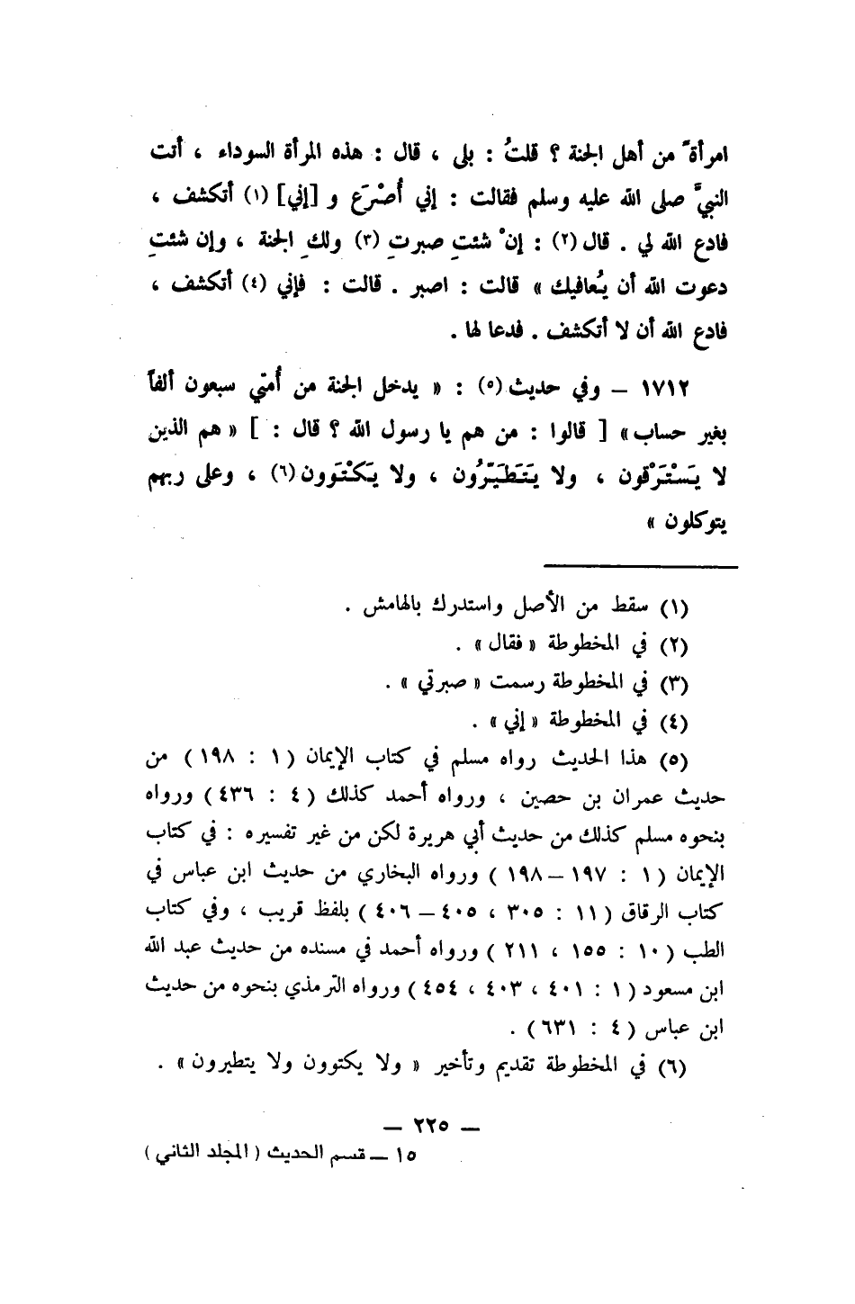 5 هذا الحديث رواه مسلم في كتاب الإيمان (1/198) من حديث عمران بن حصين, ورواه أحمد كذلك (4/436) ، ورواه بنحوه مسلم كذلك من حديث أبي هريرة، لكن من غير تفسيره: في كتاب الإيمان (1/197، 198) ، ورواه البخاري من حديث ابن عباس في كتاب الرقاق (11/305, 405، 406) بلفظ قريب, وفي كتاب الطب (10/155, 211) ، ورواه أحمد في مسنده من حديث عبد الله بن مسعود (1/401, 403, 454) ، ورواه الترمذي بنحوه من حديث ابن عباس (4/631) .
