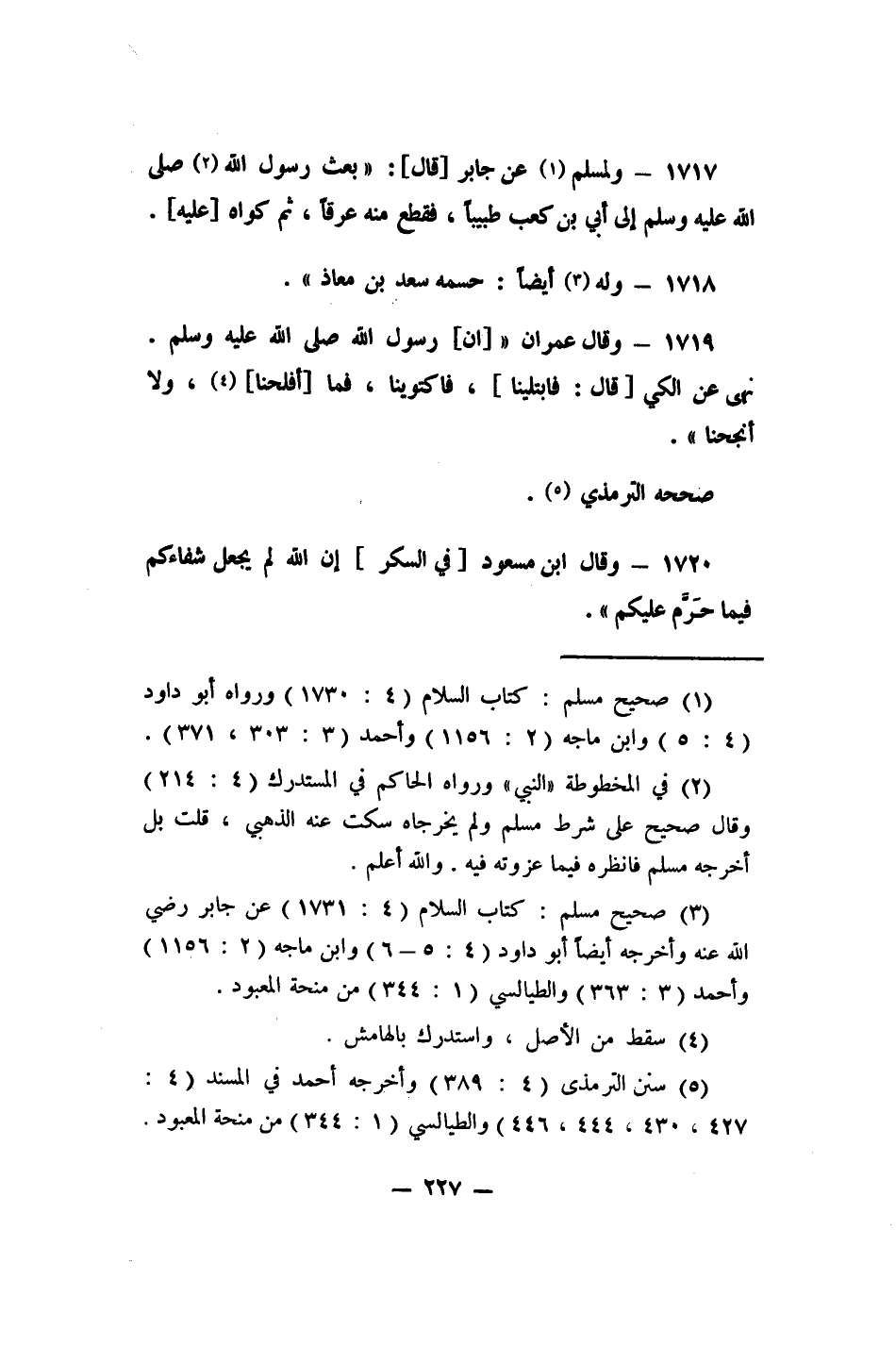 1719- قال عمران: " [أن] رسول الله صلى الله عليه وسلم نهى عن الكي، [قال: فابتُلينا] ، فاكتوينا، فما [أفلحنا] ، 3 ولا أنجحنا". صححه الترمذي 4
