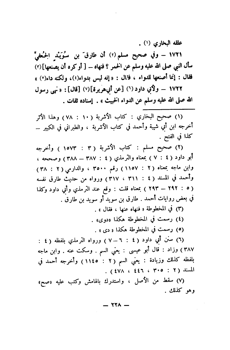 1721- وفي صحيح مسلم: 2 "أن طارقَ بن سويد الجعفي سأل النبي صلى الله عليه وسلم عن الخمر؟ فنهاه -[أو كره أن يصنعها]- 3 فقال: إنما أصنعها للدواء، فقال: إنه ليس بدواء، 4 ولكنه داء" 5.