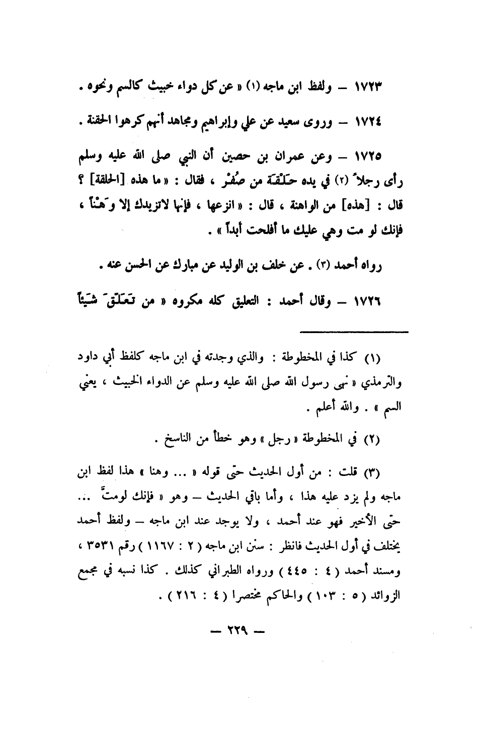 1725- وعن عمران بن حصين: "أن النبي صلى الله عليه وسلم رأى رجلاً 2 في يده حَلْقَة من صُفْر، فقال: ما هذه [الحلقة] ؟ قال: [هذه] من الواهنة، قال: انزعها! فإنها لا تزيدك إلا وَهْناً؛ فإنك لو متَّ وهي عليك ما أفلحت أبداً". رواه أحمد 3 عن خلف بن الوليد عن مبارك عن الحسن عنه.