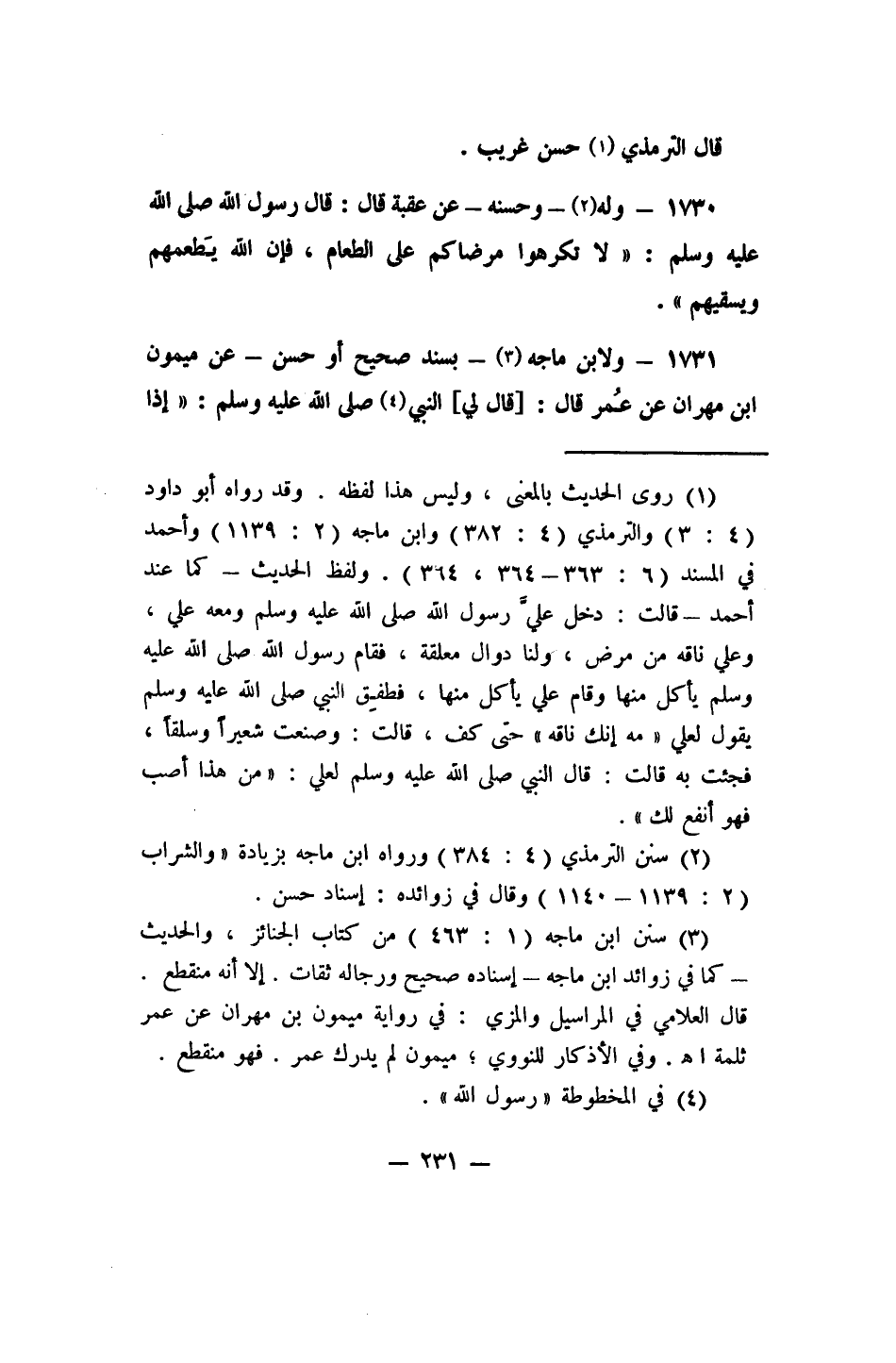 1730- وله 2 - وحسنه - عن عقبة قال: قال رسول الله صلى الله عليه وسلم: "لا تُكرهوا مرضاكم على الطعام، فإن الله يطعمهم ويسقيهم".
