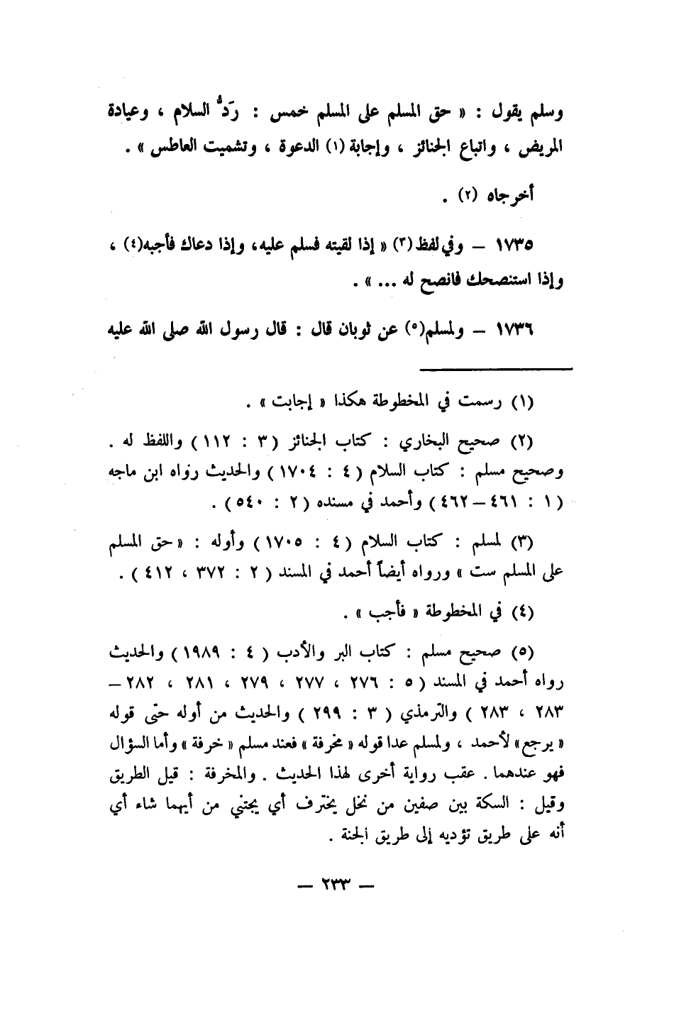 1735- وفي لفظ: 3 "إذا لقيته فسلم عليه، وإذا دعاك فأجبه، 4 وإذا استنصحك فانصح له ... ".
