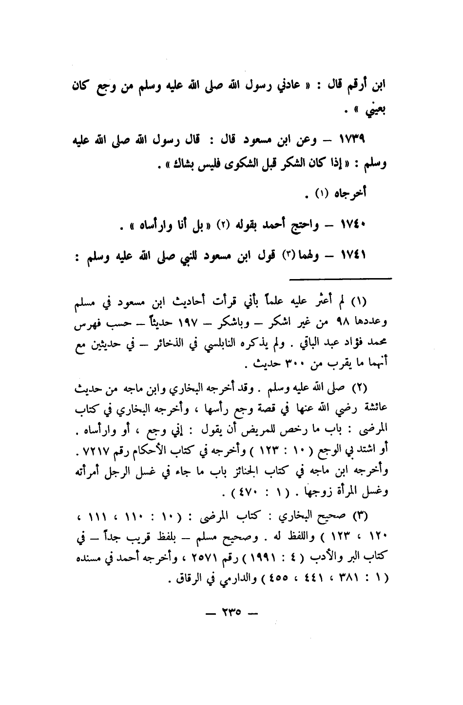 1 لم أعثر عليه، علماً بأني قرأت أحاديث ابن مسعود في مسلم وعددها (98) من غير (اشكر) ، وبـ (اشكر) (197) حديثاً، حسب فهرس محمد فؤاد عبد الباقي. ولم يذكره النابلسي في الذخائر، في حديثين مع أنهما ما يقرب من (300) حديث.