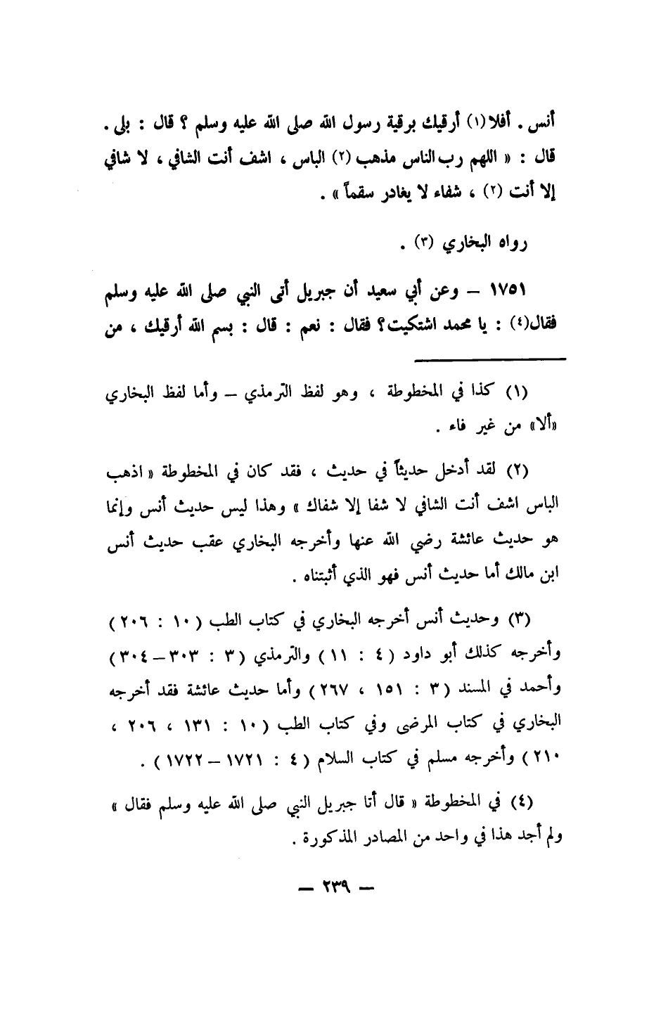1751- وعن أبي سعيد: "أن جبريل أتى النبي صلى الله عليه وسلم فقال: 5 يا محمد، اشتكيت؟ فقال: نعم. قال: بسم الله أرقيك، من