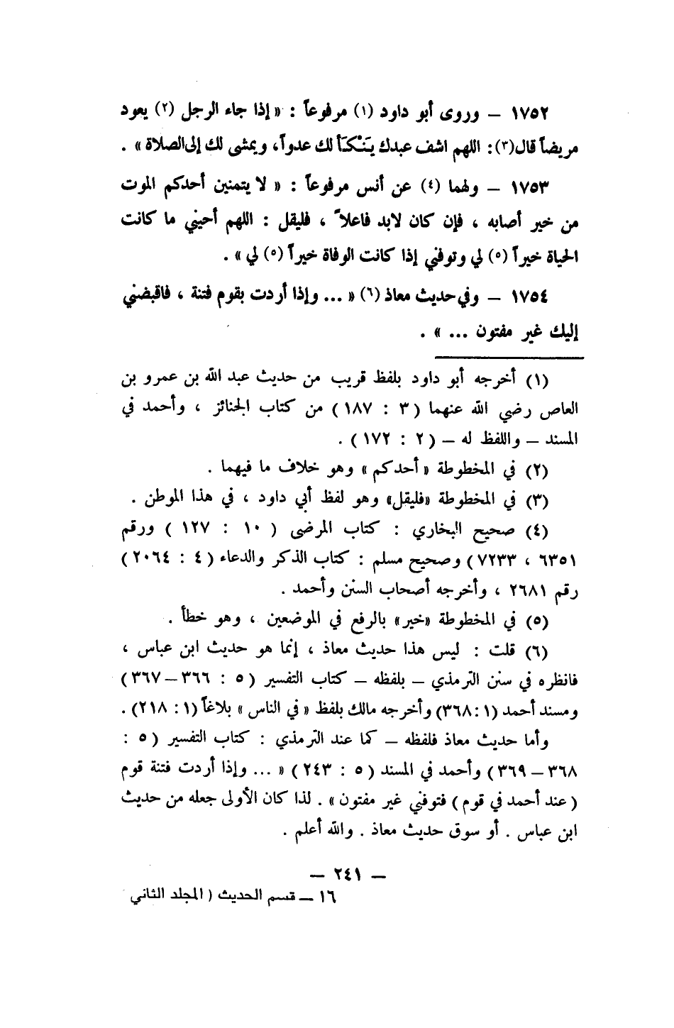 1753- ولهما 4 عن أنس، مرفوعاً: "لا يتمنين أحدكم الموت من ضُرّ أصابه؛ فإن كان لا بد فاعلاً، فليقل: اللهم أحيني ما كانت الحياة خيراً لي، 5 وتوفني إذا كانت الوفاة خيراً 6 لي".