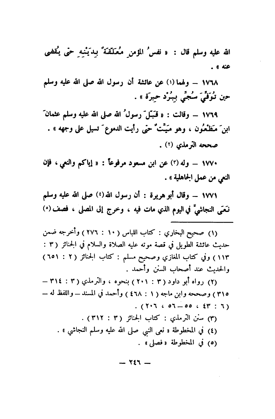 1769- وقالت: "قَبّلَ رسولُ الله صلى الله عليه وسلم عثمانَ بنَ مَظْعُون، وهو مَيِّتٌ، حتى رأيت الدموعَ تسيل على وجهه". صححه الترمذي 2.