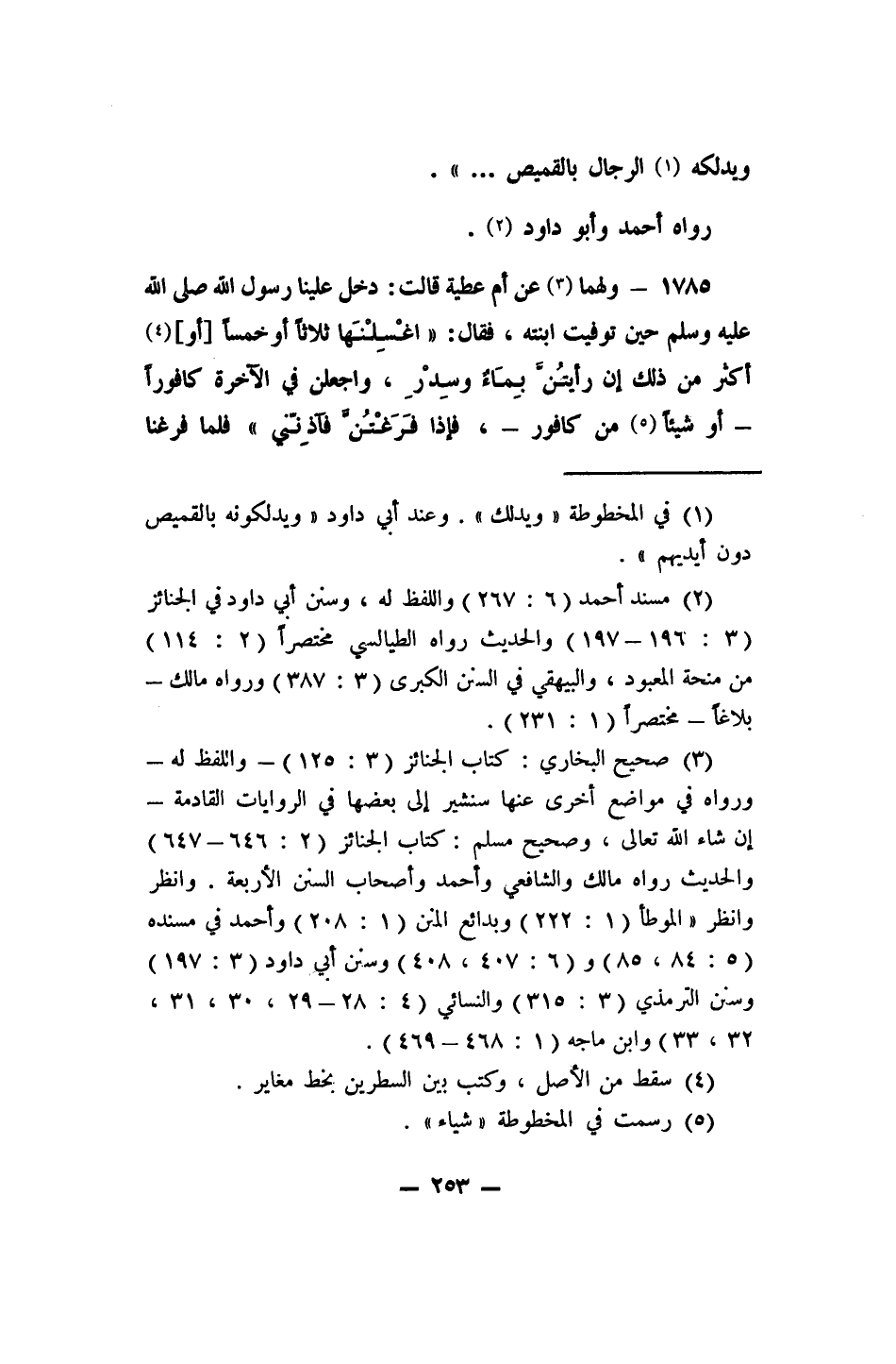 1785- ولهما 3 عن أم عطية قالت: "دخل علينا رسول الله صلى الله عليه وسلم حين توفيت ابنته، فقال: اغْسِلْنَها ثلاثاً أو خمساً، [أو] 4 أكثر من ذلك إن رأيتُنَّ بِمَاءٍ وسِدْرِ، واجعلن في الآخرة كافوراً - أو شيئاً 5 من كافور -، فإذا فَرَغْتُنَّ فآذِنّني. فلما فرغنا