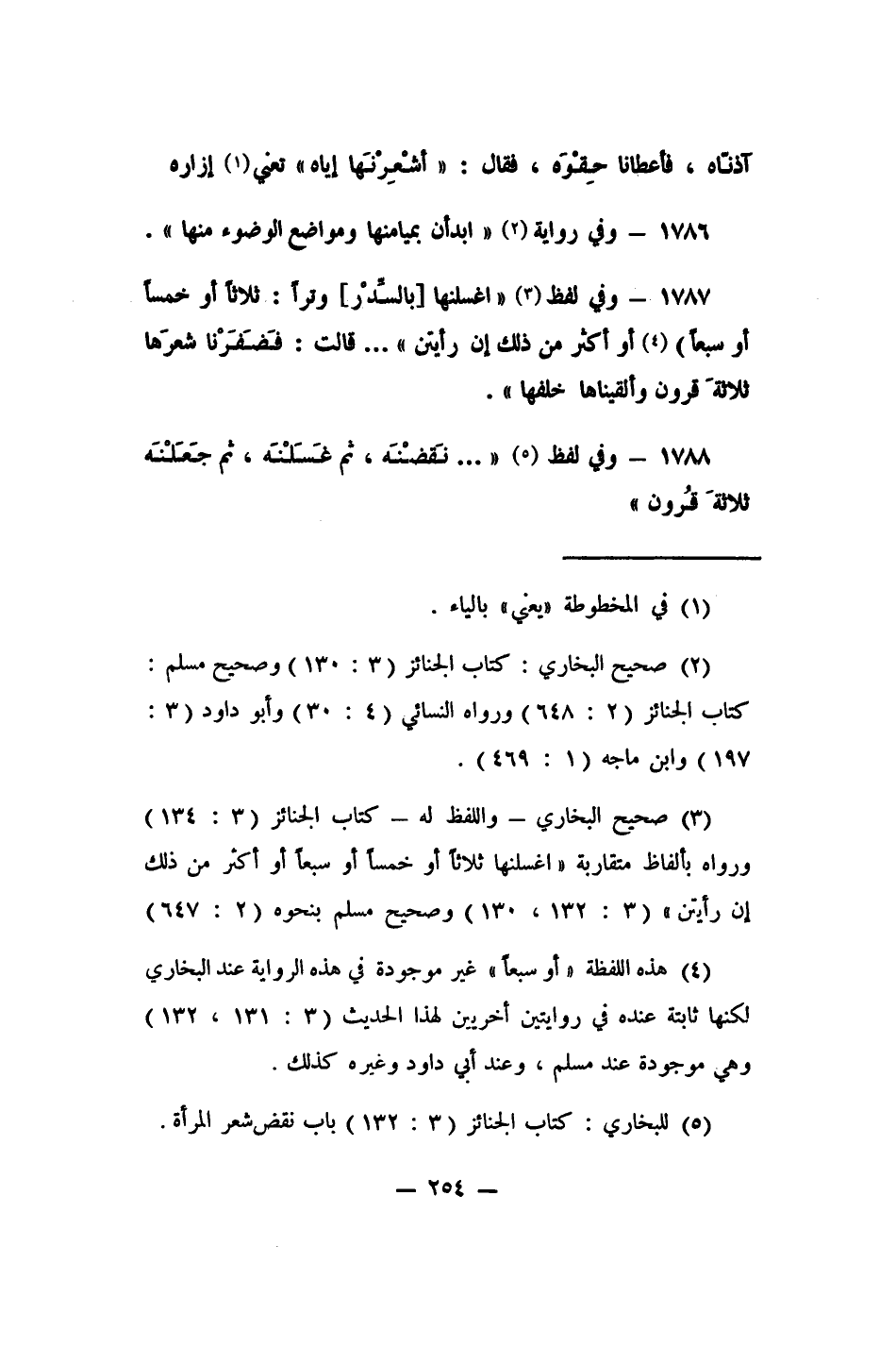 1787- وفي لفظ: 3 "اغسلنها [بالسِّدْر] وتراً: ثلاثاً أو خمساً (أو سبعاً) 4 أو أكثر من ذلك إن رأيتن ... قالت: فَضَفَرْنا شعرها ثلاثة قرون، وألقيناها خلفها".