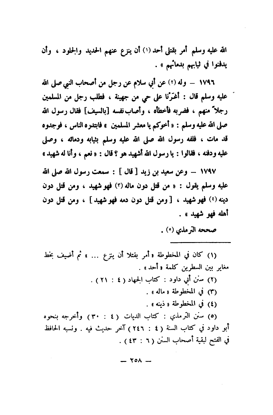 1797- وعن سعيد بن زيد [قال] : سمعت رسول الله صلى الله عليه وسلم يقول: "من قُتل دون ماله 3 فهو شهيد، ومن قُتل دون دينه 4 فهو شهيد، [ومن قُتل دون دمه فهو شهيد] ، ومن قُتل دون أهله فهو شهيد". صححه الترمذي 5.