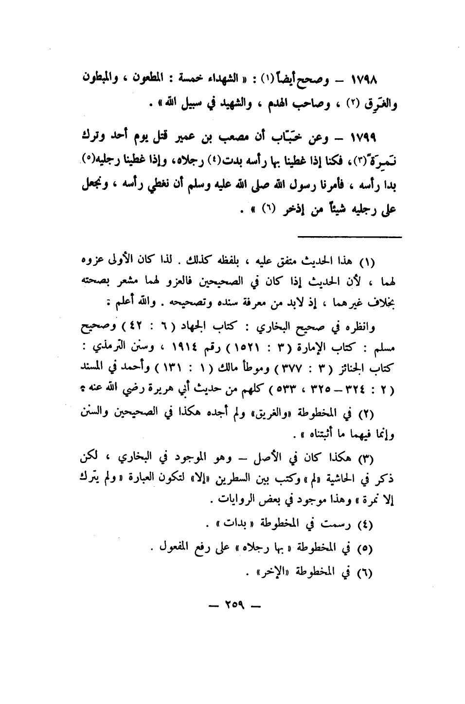 1798- وصحح أيضاً: 1 "الشهداء خمسة: المطعون، والمبطون والغَرِق، 2 وصاحب الهدم، والشهيد في سبيل الله".