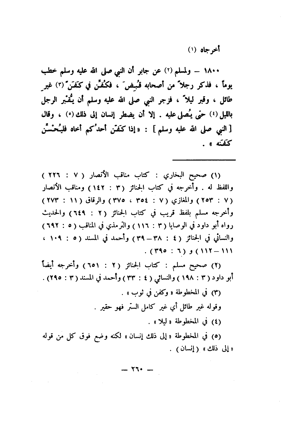 1800- ولمسلم 2 عن جابر: "أن النبي صلى الله عليه وسلم خطب يوماً، فذكر رجلاً من أصحابه قُبض، فكُفِّن في كَفَنٍ 3 غيرِ طائل، وقُبر ليلاً، فزجر النبي صلى الله عليه وسلم أن يُقْبر الرجل بالليل 4 حتى يُصلى عليه"، إلا أن يضطر إنسان إلى ذلك 5، وقال [النبي صلى الله عليه وسلم] : " إذا كفن أحدكم أخاه، فليحسن كفنه".