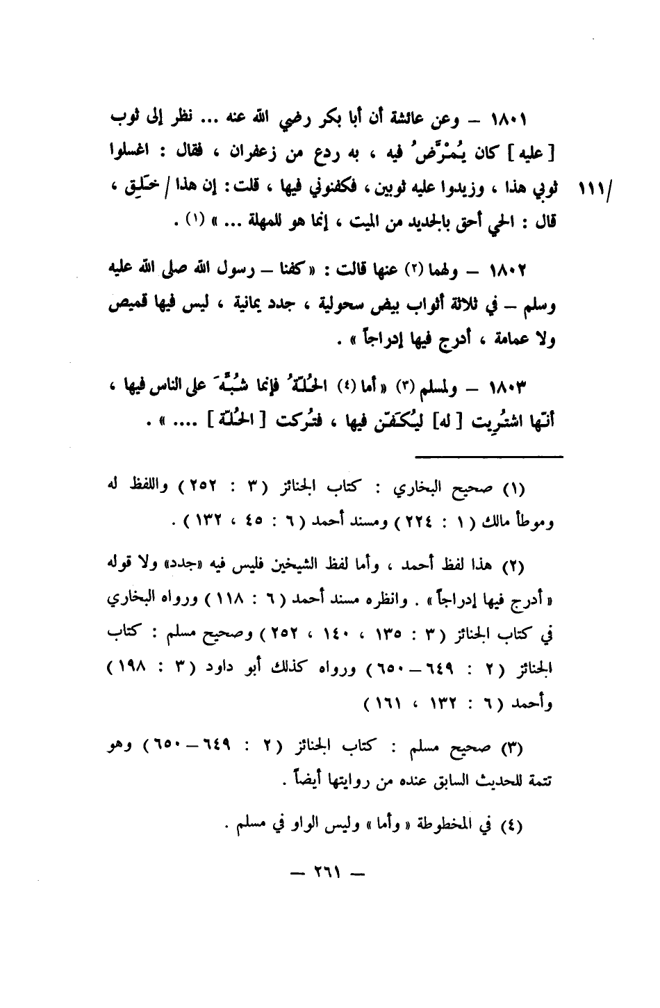 2 هذا لفظ أحمد, وأما لفظ الشيخين فليس فيه: (جدد) ، ولا قوله: (أدرج فيها إدراجاً) . وانظر: مسند أحمد (6/118) ، ورواه البخاري في كتاب الجنائز (3/135, 140, 252) ، وصحيح مسلم: كتاب الجنائز (2/649، 650) ، ورواه كذلك أبو داود (3/198) ، وأحمد (6/132, 161) .