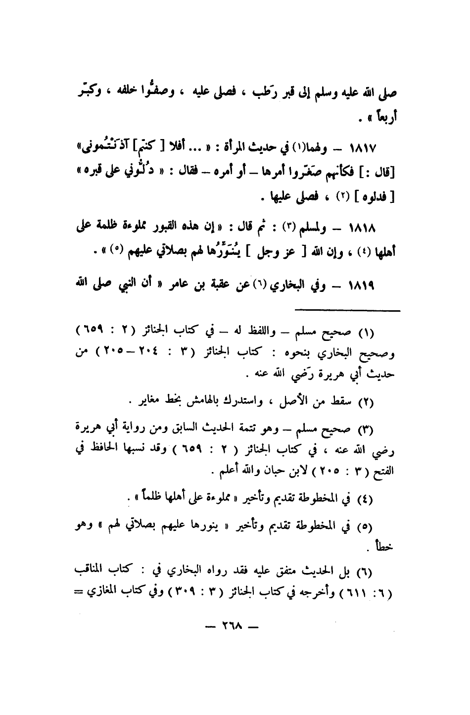 1818- ولمسلم: 3 "ثم قال: إن هذه القبور مملوءة ظلمة على أهلها، 4 وإن الله [عز وجل] يُنَوِّرُها لهم بصلاتي عليهم " 5.