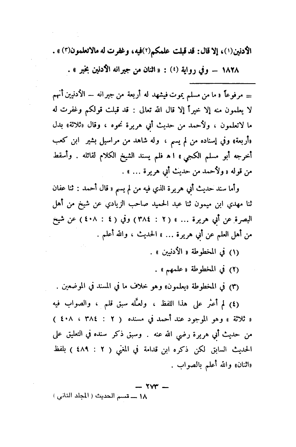 4 لم أعثر على هذا اللفظ, ولعله سبق قلم, والصواب فيه: (ثلاثة) ، وهو الموجود عند أحمد في مسنده (2/384, 408) من حديث أبي هريرة، رضي الله عنه. وسبق ذكر سنده في التعليق على الحديث السابق لكن ذكره ابن قدامة في المغني (2/489) بلفظ: (اثنان) . والله أعلم بالصواب.
