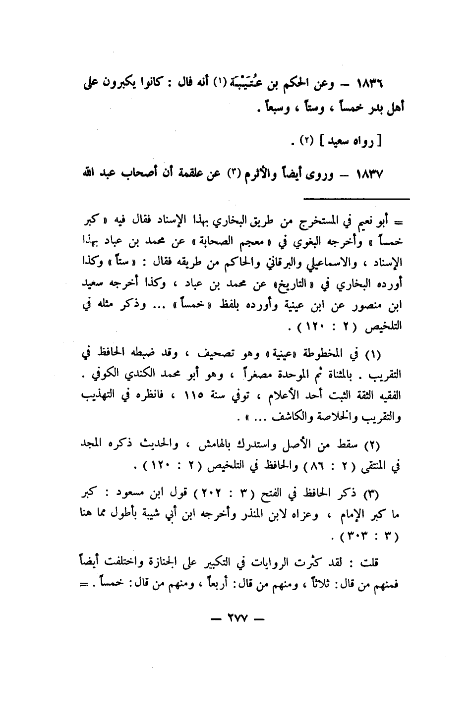 1836- وعن الحكم بن عُتَيْبَة 1 أنه قال: "كانوا يكبرون على أهل بدر خمساً، وستاً، وسبعاً". [رواه سعيد] 2.