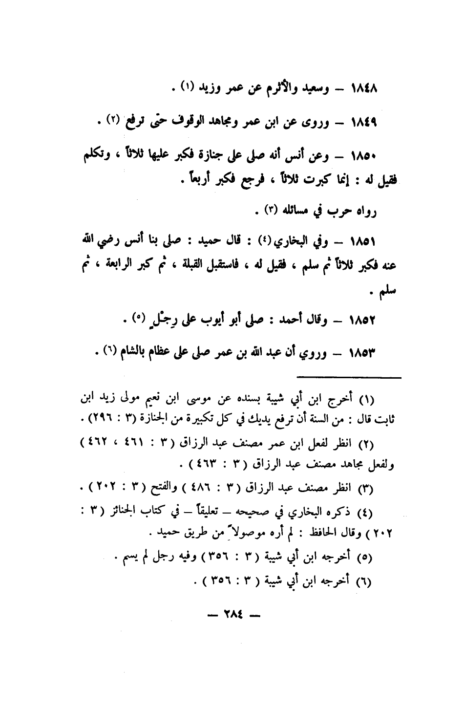 1851- وفي البخاري: 4 قال حميد: "صلى بنا أنس رضي الله عنه فكبر ثلاثاً ثم سلم، فقيل له، فاستقبل القبلة، ثم كبر الرابعة، ثم سلم".