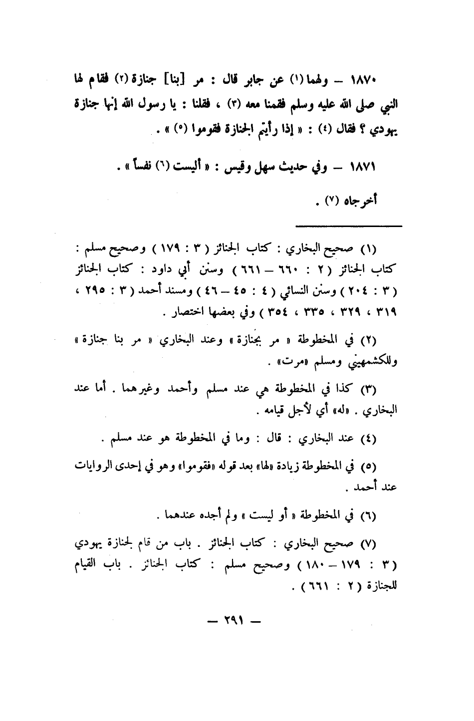 1870- ولهما 1 عن جابر قال: "مر [بنا] جنازة 2 فقام لها النبي صلى الله عليه وسلم فقمنا معه، 3 فقلنا: يا رسول الله، إنها جنازة يهودي. فقال: 4 إذا رأيتم الجنازة فقوموا" 5.