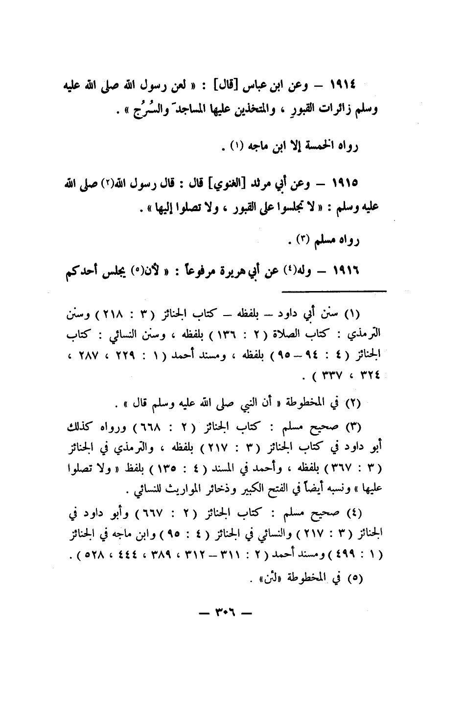 3 صحيح مسلم: كتاب الجنائز (2/668) ، ورواه كذلك أبو داود في كتاب الجنائز (3/217) بلفظه, والترمذي في الجنائز (3/367) بلفظه, وأحمد في المسند (4/135) بلفظ: (ولا تصلوا عليها) ، ونسبه أيضاً في الفتح الكبير، وذخائر المواريث للنسائي.