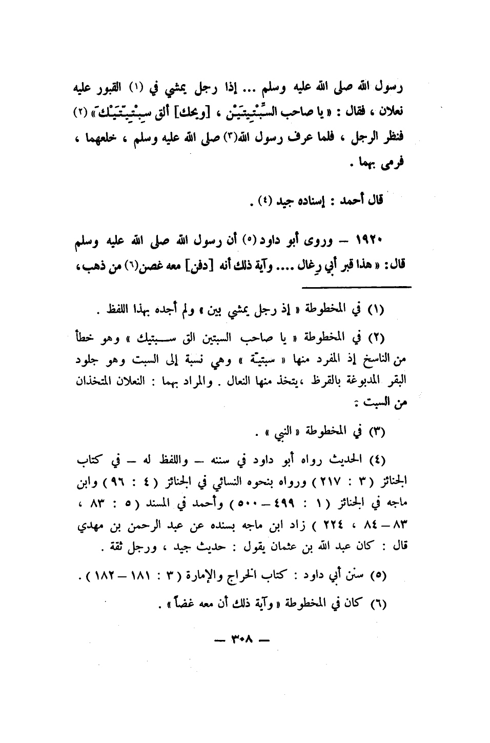 رسول الله صلى الله عليه وسلم ... إذا رجل يمشي في القبور 1 عليه نعلان، فقال: يا صاحب السِبْتِيَتيْن، [ويحك!] ألق سِبْتِيّتَيْكَ، 2 فنظر الرجل، فلما عرف رسول الله 3 صلى الله عليه وسلم خلعهما، فرمى بهما". قال أحمد: إسناده جيد 4.