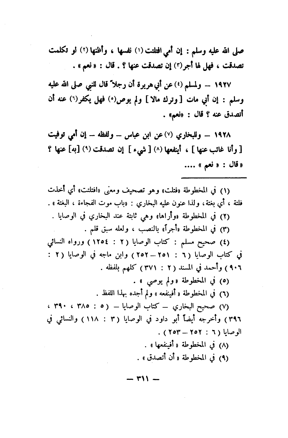 7 صحيح البخاري، كتاب الوصايا، (5/385, 390, 396) ، وأخرجه أيضاً أبو داود في الوصايا (3/118) ، والنسائي في الوصايا (6/252، 253) .