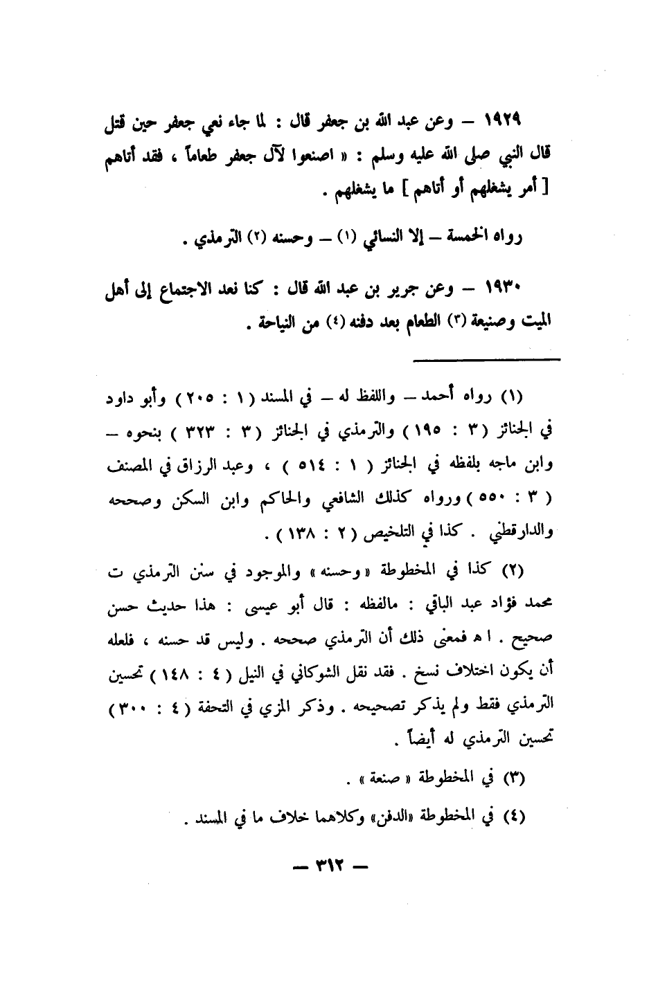 1929- وعن عبد الله بن جعفر قال: "لما جاء نعي جعفر حين قُتل، قال النبي صلى الله عليه وسلم: اصنعوا لآل جعفر طعاماً، فقد أتاهم [أمر يشغلهم أو أتاهم] ما يشغلهم". رواه الخمسة - إلا النسائي 1 - وحسنه 2 الترمذي.