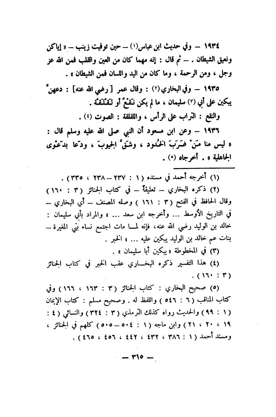 1934- وفي حديث ابن عباس 1 - حين توفيت زينب -: "إياكن ونعيق الشيطان! ثم قال: إنه مهما كان من العين والقلب فمن الله عز وجل ومن الرحمة، وما كان من اليد واللسان فمن الشيطان".